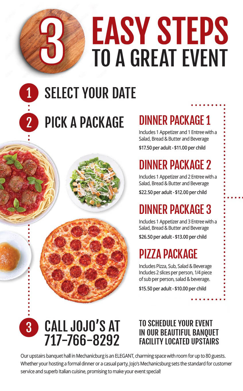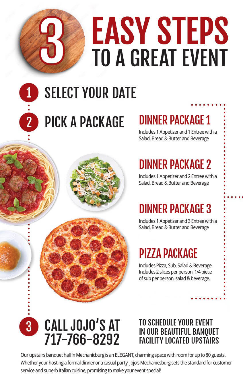 When celebrating your next event, think JoJo’s Pizza & Pasta. For business meetings, receptions, or any special events, our banquet facility can entertain up to 80 of your guests with fully catered trays of delicious Italian cuisine. Contact us with questions or reservations. We look forward to hearing from you.
